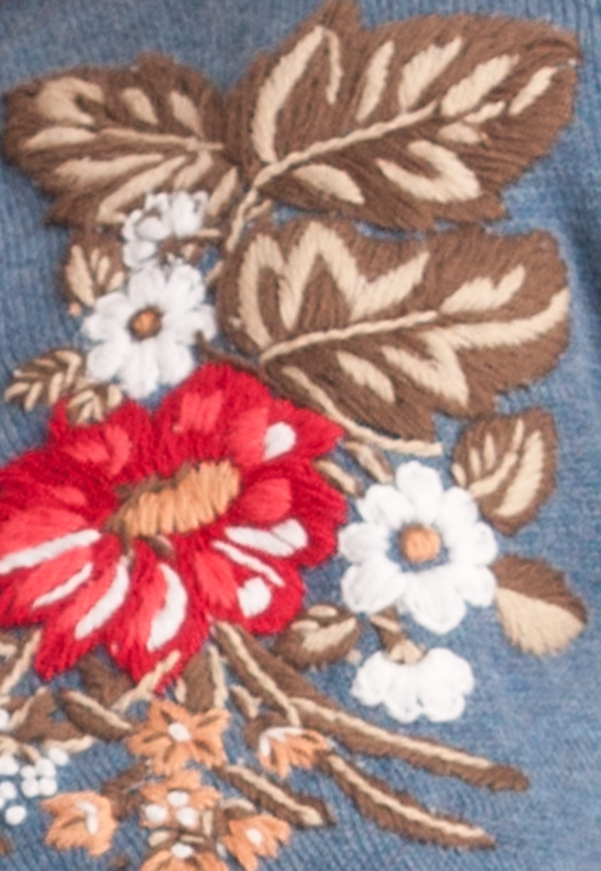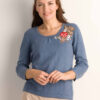 Tulchan Provence pullover. Deze trui met ronde hals heeft een chique stijl. Deze puur katoenen trui is uitgevoerd in een modieuze blauwe tint en heeft een geborduurd detail van bloemen en bladeren aan de voorkant van dit model. Bovendien heeft dit model driekwartmouwen.