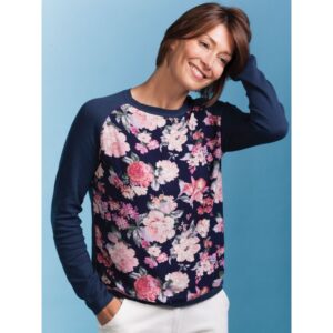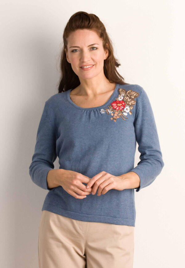 A chic style, this scoop neck jumper is perfect for the new season. This pure cotton jumper features in a fashionable shade of blue and incorporates a floral and leaf embroidered detail to the front of this style. In addition, this style features three quarter length sleeves.