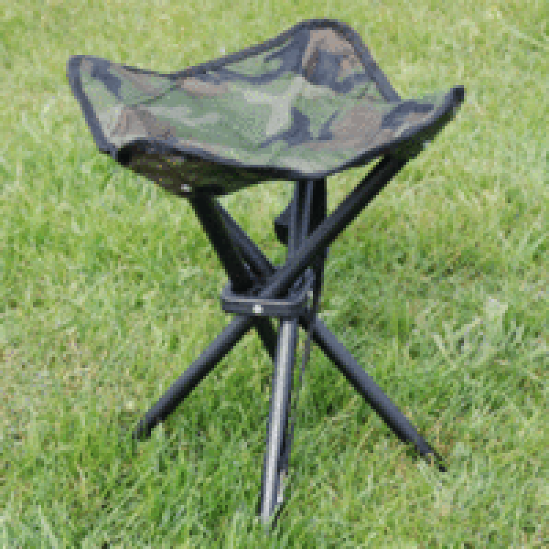 Samenvouwbaar krukje. Het katoenen dekje is in camouflage. Met draagfoedraal. Stabiel door zijn vier poten.