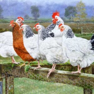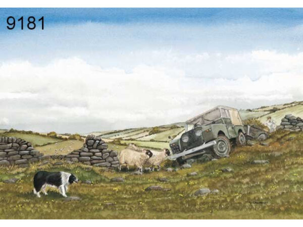 Wenskaart / correspondentiekaart A Watchfull Eye. “Ik hou jullie in de gaten”, zegt deze Border Collie in zichzelf. Stoere Land Rover met aanhanger in de achtergrond.