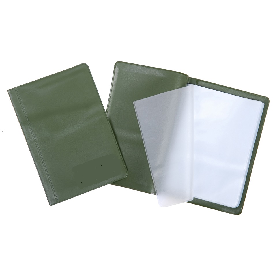 Groene flexibele map op A5 formaat met 20 doorzichtige hoezen, dus goed voor 40 blz papieren die mooi schoon en droog blijven. Is strikt genomen geen Nyrex (andere kwaliteit plastic), maar lijkt er op.