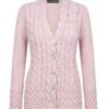 Dit klassieke getailleerde vest met V-hals in een zacht hoefijzerpatroon met trellis-steekdetails aan de zoom en mouwen, is zowel flatterend als comfortabel.