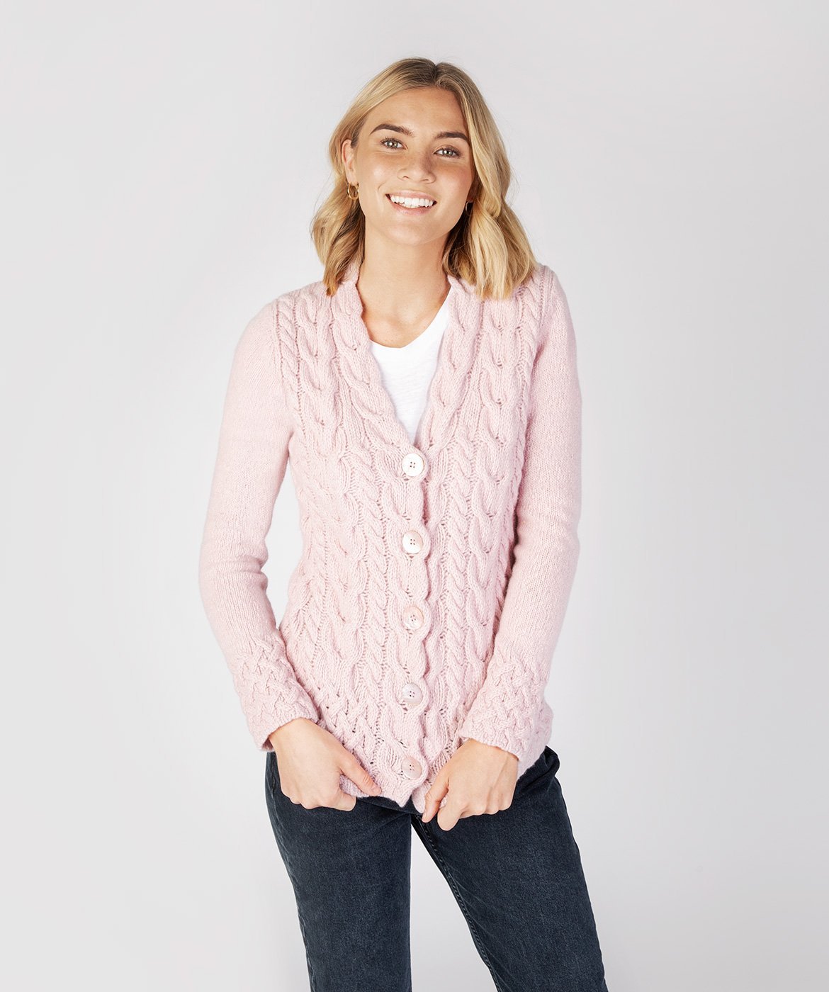 Grote zeeschelpknopen voegen vrouwelijke details toe. Gemaakt van een mix van 95% wol, 5% kasjmier voor een nog zachter, meer luxe handgevoel.