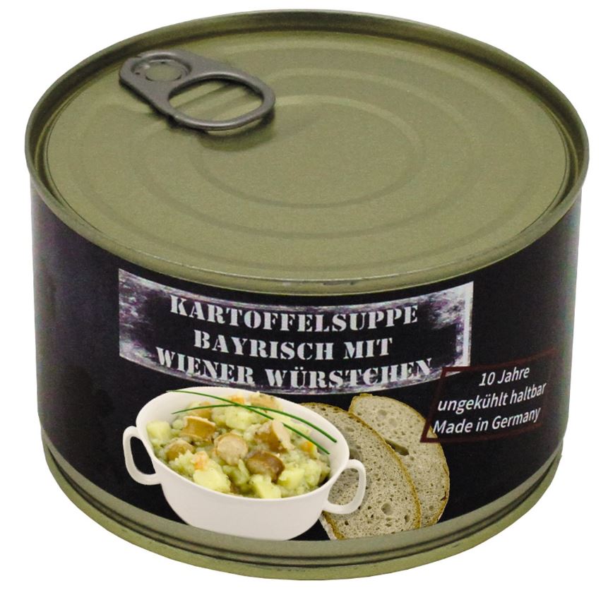 Aardappelsoep met Weense worstjes. Zeer lang houdbaar.