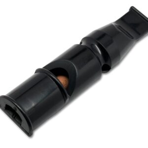 Middelgrote Acme Thunderer rolfluit. Zwarte kunststof. Watervaste erwt. Waterproof pea whistle with square mouthpiece.