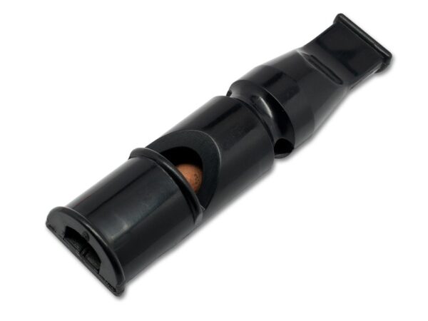 Dubbele fluit met een rolfluit voor stop/zit en een hoge ‘kom’ fluit. Met oog voor veter.