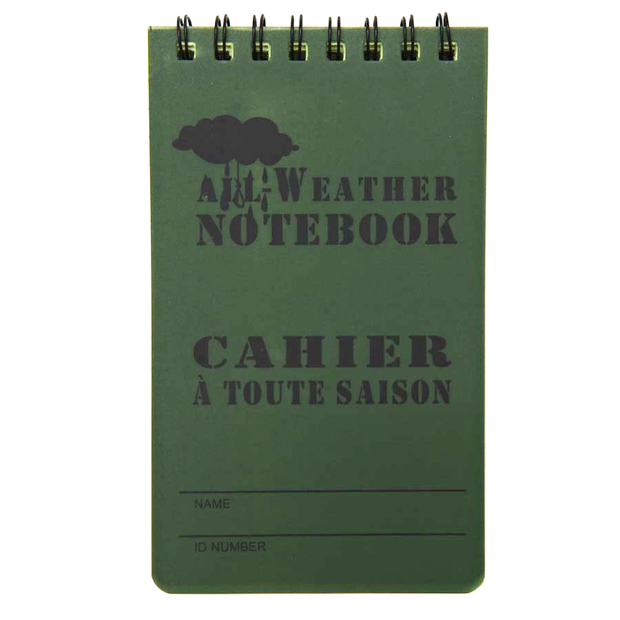 Notitieblok van groen watervast papier. Maak ook in de stromende regen je notitie’s.