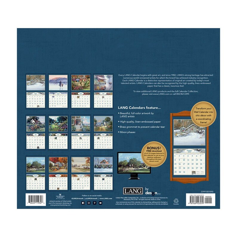 Amerikaanse Lang kalender. LANG-wandkalenders hebben maandelijkse full colour afbeeldingen, elegant linnen reliëfpapier en een koperen oogje om op te hangen.