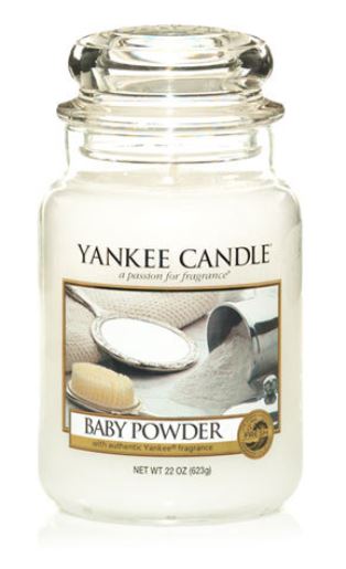 Yankee Candle Bayby Powder geurkaars in een grote glazen pot. Een rustgevende, frisse geur die de geest zachtjes reinigt en een zacht vleugje onschuld geeft.