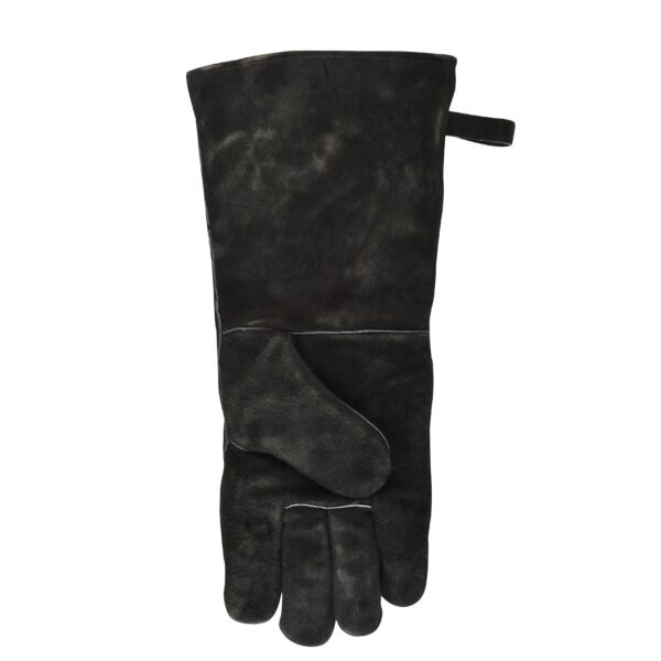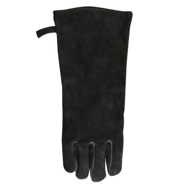 Deze leren BBQ handschoen met zijn extra lange mouw beschermt de hand en onderarm tegen hoge temperaturen bij open haard, barbecue, oven en kampvuur.