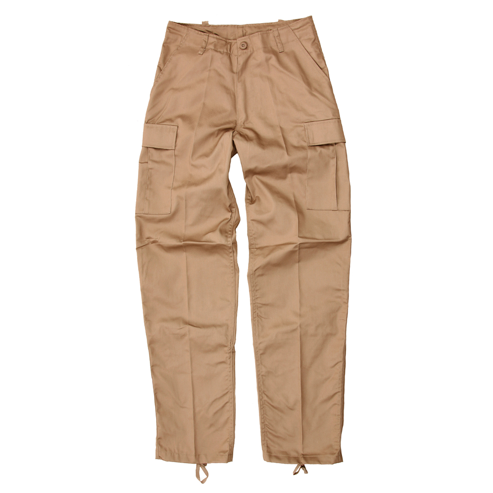 Sterke BDU (Battle Dress Uniform) broek. Heeft twee steekzakken, twee dijbeenzakken, twee kontzakken (met klep), koordjes onderin de pijpen om die eventueel aan te kunnen trekken. Messing rits. Verstelbaar in de taille.