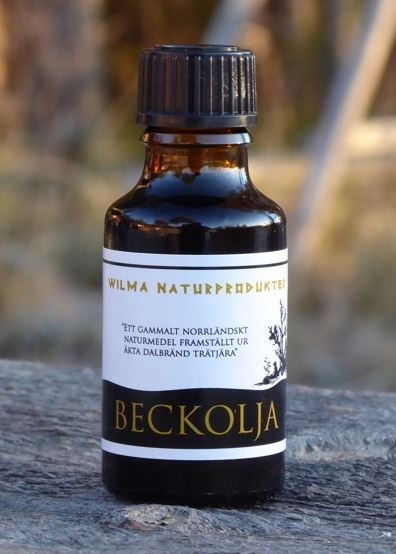 The original forest perfume of Lapland derived from traditional pine tar production. The original forest perfume of Lapland derived from traditional pine tar production. A multipurpose product that is used in many of Wilmas products. Used for centuries in Lapland as protection against the dreaded mosquito plague in the summers. With a strong pine tar smell this is product brings you a real feeling of northern Scandinavian forest. Wild boar is attracted to the smell and it can therefore be applied to lure them. “Beckolja” is a genuine natural product made from boiled tar and has an aromatic flavour of forest and wildness.