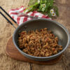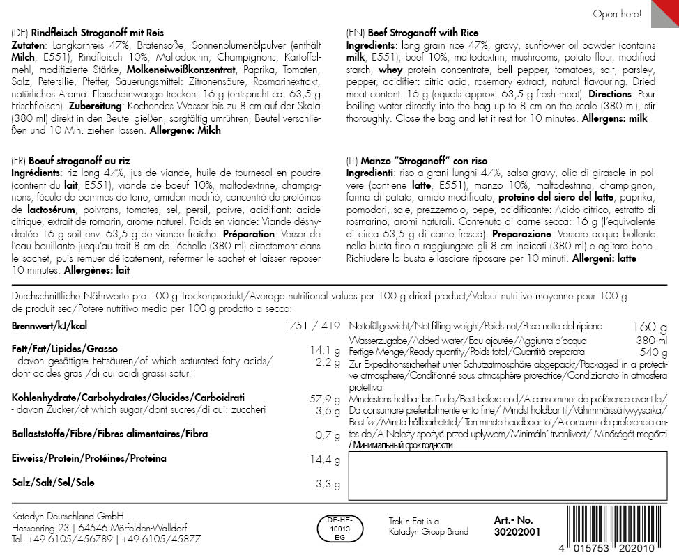 Trek n Eat Beef Stroganoff met rijst. Genoemd naar de Russische koninklijke familie Stroganoff. De Trek’n Eat versie van de klassieke maaltijd is gemaakt van rundvlees en rijst. De smaak kan individueel worden verfijnd door het toevoegen van extra’s zoals paprika, azijn, cognac of witte wijn, afhankelijk van wat je bij je hebt. Maar ook zonder toevoegingen is Beef Stroganoff met rijst een stevige klassieker voor buitenmaaltijden – een favoriet die de fans ver buiten de grenzen van de noordwestelijke Russische metropool met zijn roerige 200-jarige geschiedenis heeft gevonden.