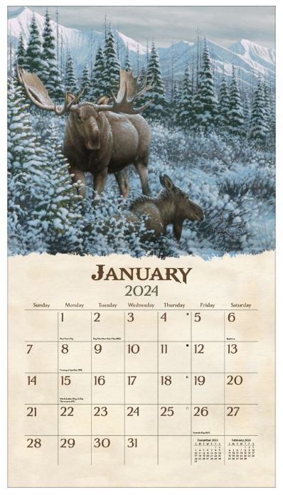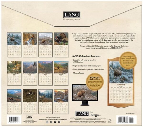 LANG wandkalenders zijn voorzien van maandelijkse kleurenafbeeldingen, elegant linnen reliëfpapier en een messing ring om op te hangen.