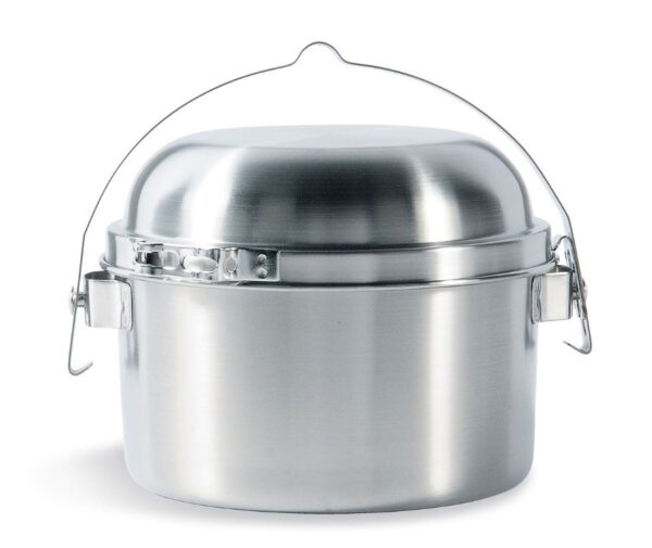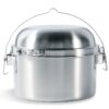 Roestvrij stalen Billy Kettle. Voelt zich net zo thuis op een brander als boven een houtvuur. Het deksel is tevens te gebruiken als een wokachtige braadpan en heeft een losse greep.