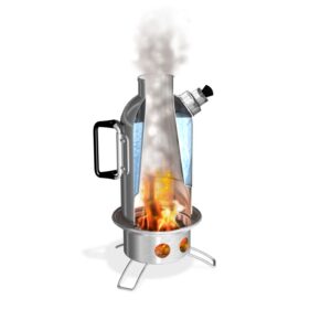Roestvrij stalen Billy Kettle. Voelt zich net zo thuis op een brander als boven een houtvuur. Het deksel is tevens te gebruiken als een wokachtige braadpan en heeft een losse greep.