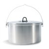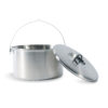 Roestvrij stalen Billy Kettle. Voelt zich net zo thuis op een brander als boven een houtvuur. Het deksel is tevens te gebruiken als een wokachtige braadpan en heeft een losse greep.