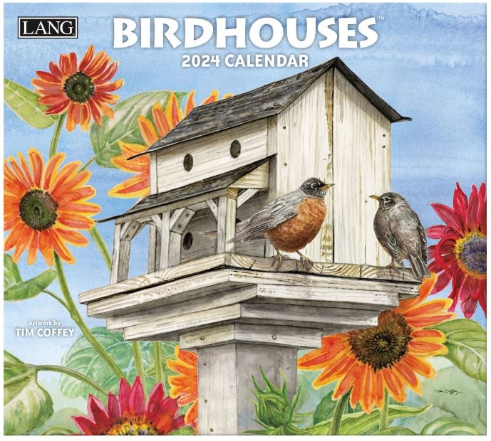 De Birdhouses 2024 Wall Calendar bevat elke maand kunstwerken van Tim Coffey van unieke en kleurrijke vogelhuisjes.