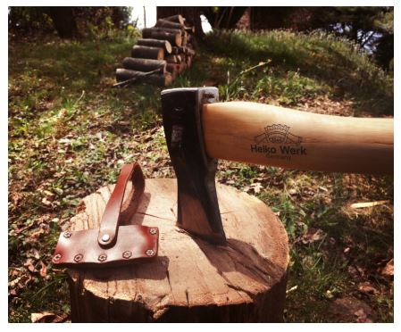 Deze houtkloofbijl wordt geleverd met een plantaardig gelooide leren universele bijlhoes.