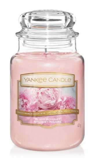Yankee Candle Blush Bouquet geurkaars in grote glazen pot. Een geur die even uitnodigend is als een op maat gemaakt middelpunt van een boeket van roze pioenrozen, lelies en citrusbloesems.