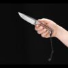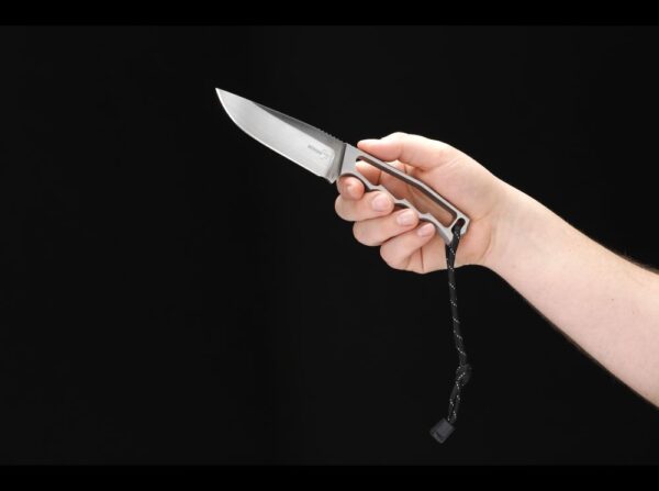 We were immediately enthusiastic when Robert Sederl from Austria showed us his compact, full integral outdoor knife, making series production simply a matter of time and technical feasibility. In spite of its minimalist design, the wilderness knife has outstanding handling characteristics and easily accomplishes any outdoor or hunting task. The solid construction from a single 440C piece ensures unsurpassed strength, while the large grip openings keep the weight within reason. The minimally hollow-ground blade also provides a rugged geometry. Shipped with black leather sheath and lanyard with reflective thread. Overall 23.1 cm. Blade 11.2 cm. Thickness 4.8 mm. Weight 199 g.