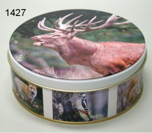 Rond koekblik met rondom afbeeldingen van bosdieren en op het deksel van een edelhert. Hoog 6,5 cm Diameter 19 cm