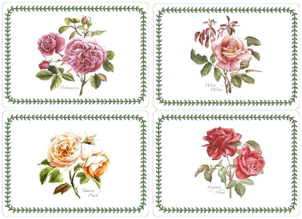 Botanic Roses placemats van Pimpernel. Set van vier placemats. Een unieke laklaag beschermt goed tegen krassen. De kurk onderzijde beschermt uw tafel.