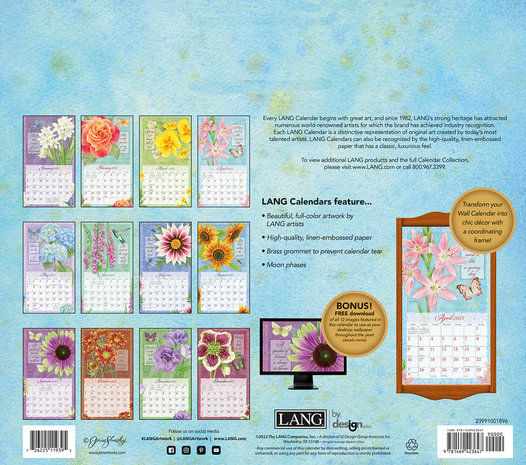 Amerikaanse Lang kalender. LANG-wandkalenders hebben maandelijkse full colour afbeeldingen, elegant linnen reliëfpapier en een koperen oogje om op te hangen.