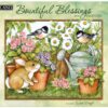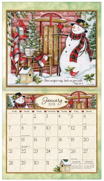 De Bountiful Blessings 2024 Wandkalender bevat elke maand kunstwerken van Susan Winget van rustige tuintaferelen gecombineerd met opbeurende citaten uit de Schrift.