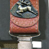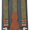 Bretels met lederen versteviging en metalen embleem, 36 mm breed. Hertenmotief.