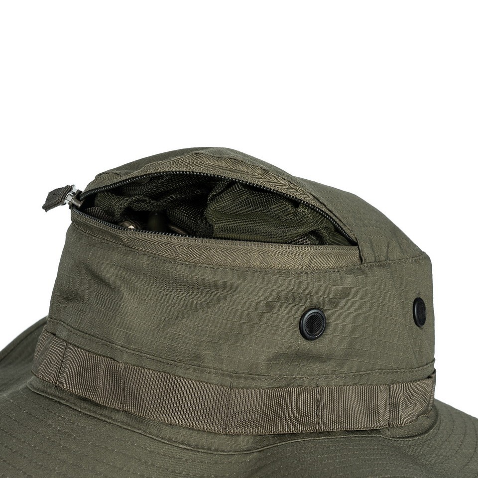 – opbergvak te sluiten met rits aan de bovenkant van de hoed
