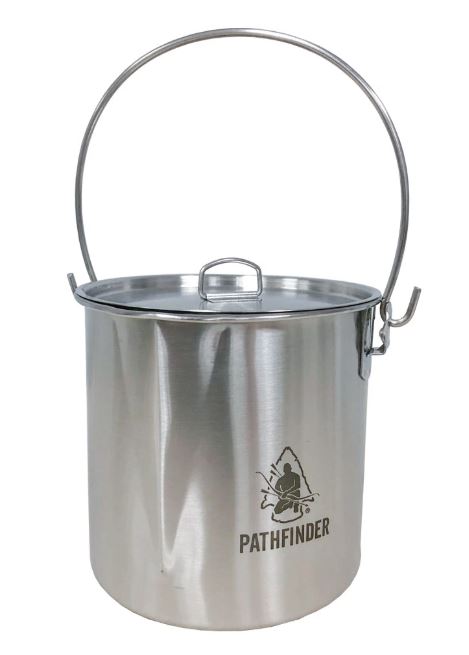 Pathfinder roestvrijstalen 64oz Bush-pot en deksel. Inhoud 1,9 liter. Of je nu in een overlevingssituatie bent of een ontspannen wandeling maakt met je gezin, op een gegeven moment gaat de bel voor het diner. De Pathfinder roestvrijstalen bushpot is licht van gewicht en heeft de capaciteit om een ââstevige maaltijd te bereiden voor een klein gezin.