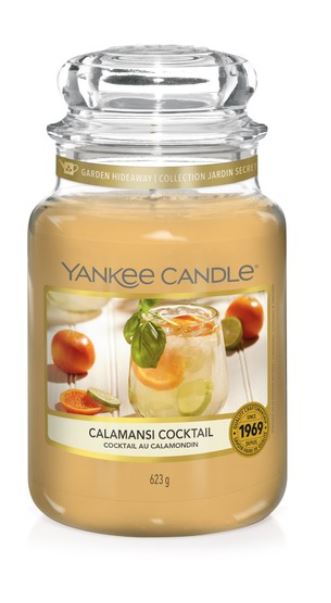 Yankee Candle Calamansi Cocktail geurkaars in een grote glazen pot. Een drankje ontworpen om te nippen in je favoriete schaduwrijke tuinplek, zowel prikkelend als ontspannend met hints van scherp citrusfruit.
