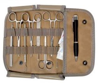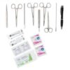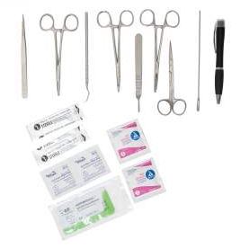 1 schaar, 1 pincet, 1 # 3 scalpelhandvat, 2 scalpelmesjes, 1 hechtdraadset, 1 houder, 1 naaldsonde, 2 alcoholdoekjes, 2 antiseptische Bzk-doekjes en 1 penlampje