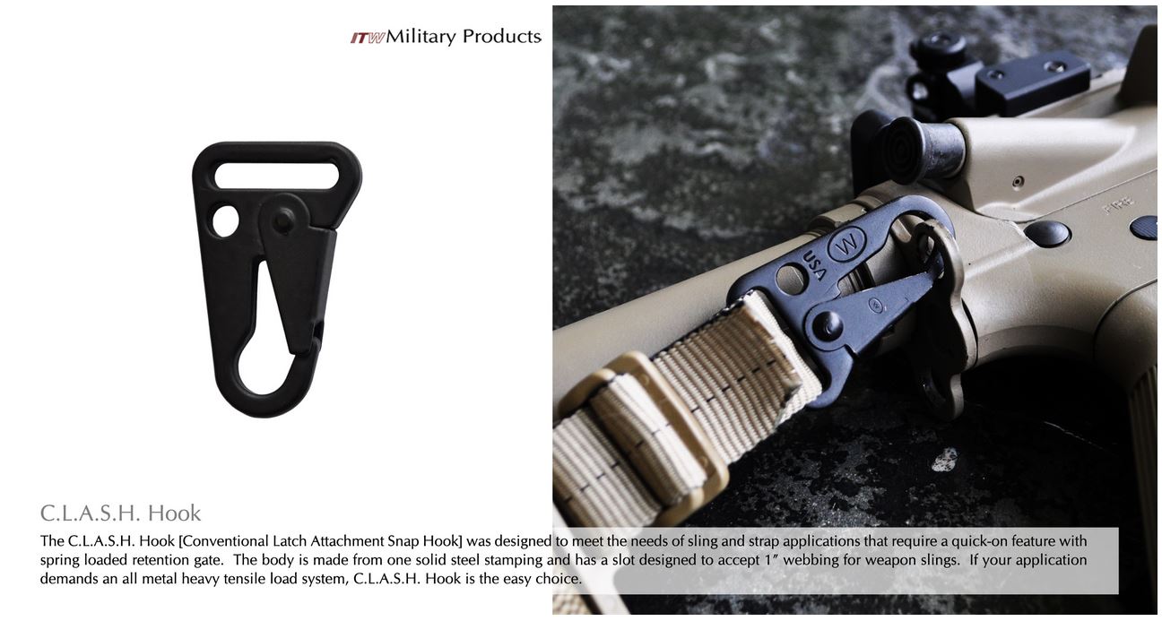 The C.L.A.S.H. Hook [CONVENTIONAL LATCH ATTACHMENT SNAP HOOK] was designed to meet the needs of sling and strap applications that require a quick-on feature with spring loaded retention gate. The body is made from one solid steel stamping and has a slot designed to accept 1? webbing for weapon slings. If your application demands an all metal heavy tensile load system, C.L.A.S.H. Hook is the easy choice.