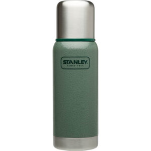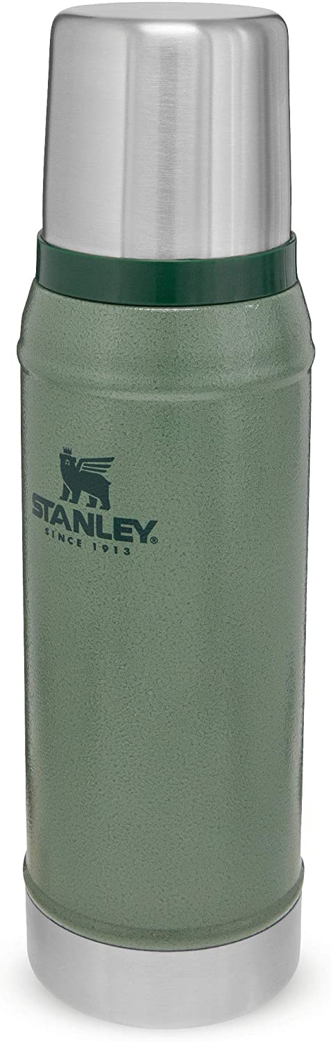 Stanley Classic 0,75 L thermosfles. Stanley thermosflessen met de groene gehamerde buitenkant worden al gemaakt sinds 1953. De nieuwe uitvoering heeft een extra wijde hals waar ijsblokjes doorheen passen en die het schoonmaken vergemakkelijkt. De Stanley houdt iets 12 uur warm of 24 uur koud. De ruimte tussen binnen- en buitenfles is vacuum en gevuld met fijngemalen houtskool, wat zorgt voor extra isolatie en een zekere bescherming geeft tegen deuken.