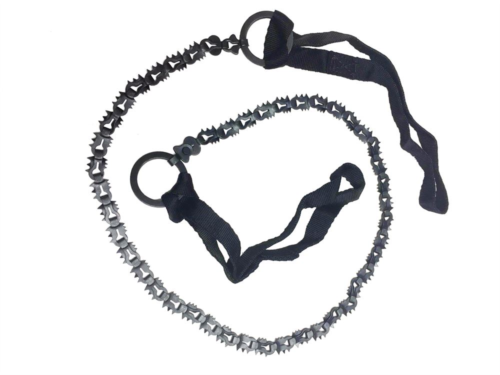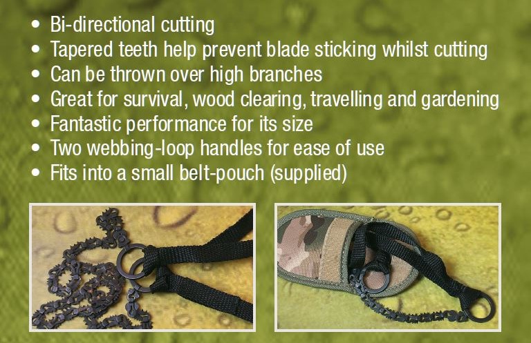 Een “Commando” kettingzaag in zakformaat, ideaal voor overlevingssituaties. De kettingzaag in je broekzak. Heeft polslussen om meer kracht te kunnen zetten. Speciaal gevormde tanden helpen voorkomen dat de ketting knel komt te zitten. Met foedraal.