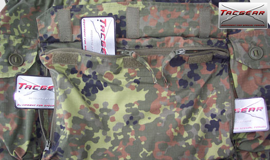 Twee zijzakken, ook zowel van boven als van opzij toegankelijk (ideaal wanneer u in liggende positie bent). De zakken zijn zo geplaatst dat ze niet in de weg zitten tijdens het dragen van een rugzak. De ritsen van de zakken hebben een extra grip voor gebruik met handschoenen. In de zakken D-ringen voor bevestiging van kleine dingen als een kompas, enz. Onderin een ring met gaasje zodat eventueel binnengedorngen water weg kan lopen. Doorsteek naar borstzak van binnengevechtsjack. Velcro strips links en rechts voor naamlinten. Kwaliteit: 50% katoen, 50% polyester ripstop. Dupont Teflon waterafstotend geimpregneerd. Gedeeltelijk gevoerd met mesh voor een optimale ventilatie. YKK ritsen.