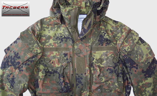 Description: 50/50 Poly/Cotton Rip Stop YKK-Zipper YKK VELCRO Hook and Loop fasteners YKK Canadian-Style Slotted Buttons YKK D-Rings in all outside pockets YKK One-Hand Cord Stopper Outside pockets with additional one hand draw cord closing/adjustment High storm collar 2 Breast pockets with compartments behind with outside excess 2 Zip map pockets 1 Zip opening on breast for inside access 2 Cargo lower pockets 2 Zip Handwarmer pockets 2 Side pockets with side entry zips 1 Large zip pocket on back side with add. side entry zips 2 Inside zip pockets mesh 1 Inner rear pouch mesh 2 Velcro two compartment arm pockets with Velcro for patches incl. covers Two-way underarm ventilation zips Zip up wired hood with volume regulation and lined with DUPONT TASLAN Rip Stop Nylon Contour designed Velcro cuffs at sleeves Velcro for name tab Velcro for rank tab Velcro flags detachable (only German version) Waist draw cord Draw cord at hem Quality cords with sealed ends Mesh eyelets in bottom of outside pockets DUPONT TEFLON impregnition