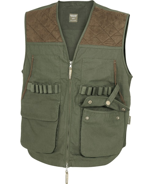 Countryman Hunters Vest. Stevig katoenen vest met versterkte schouders. Grote poacher’s pocket achter met rits. Twee grote voorzakken, twee handwarmer zakken.