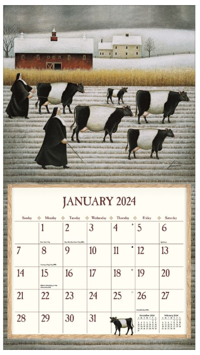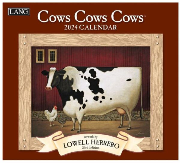 De Cows Cows Cows 2024 wandkalender bevat elke maand prachtige kunstwerken van Lowell Herrero van mooie koeien in verschillende omgevingen.