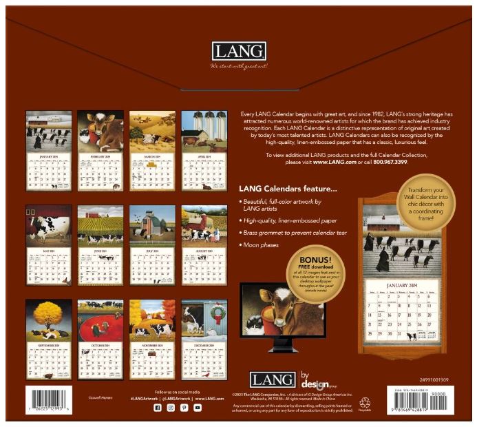 LANG wandkalenders zijn voorzien van maandelijkse kleurenafbeeldingen, elegant linnen reliëfpapier en een messing ring om op te hangen.