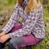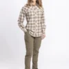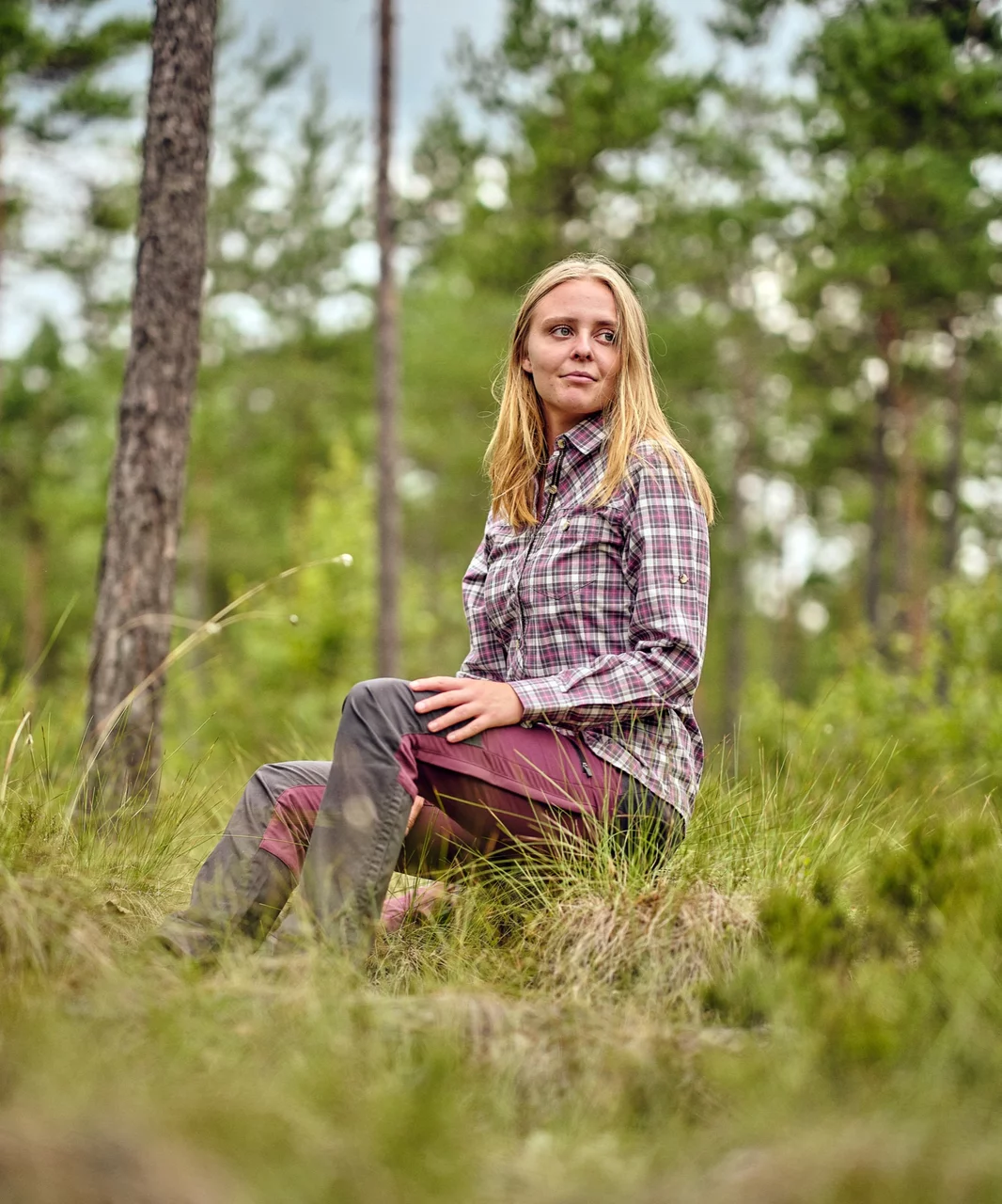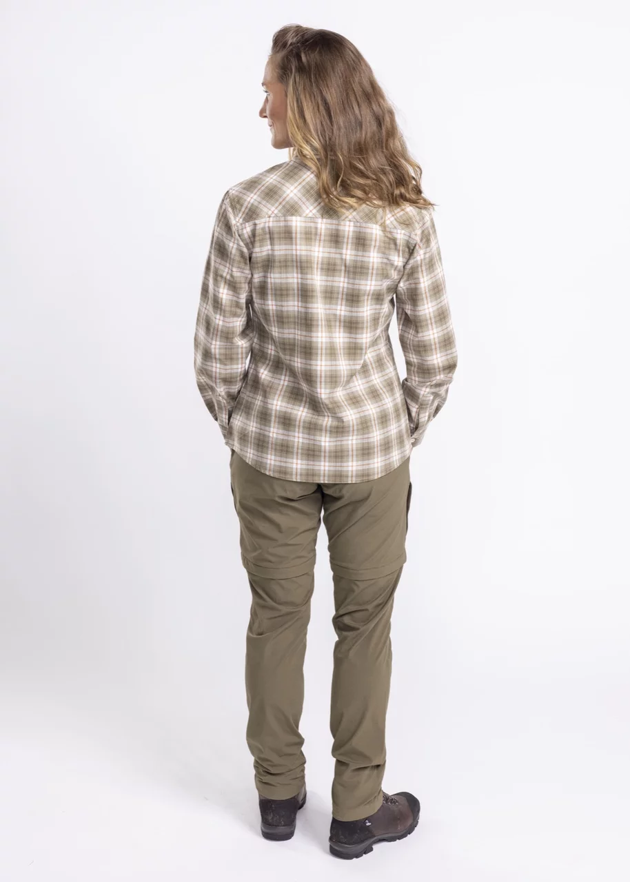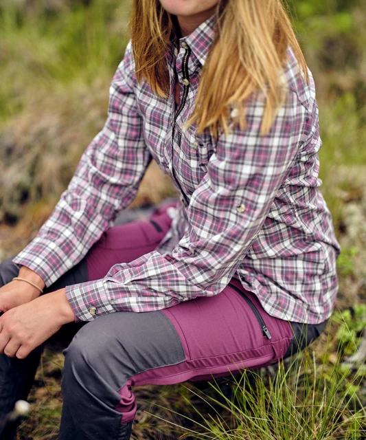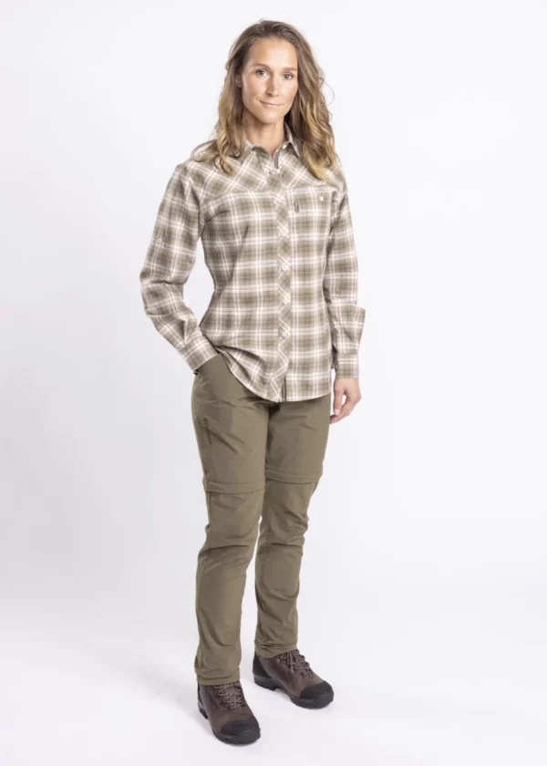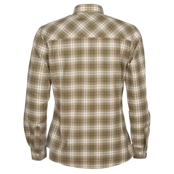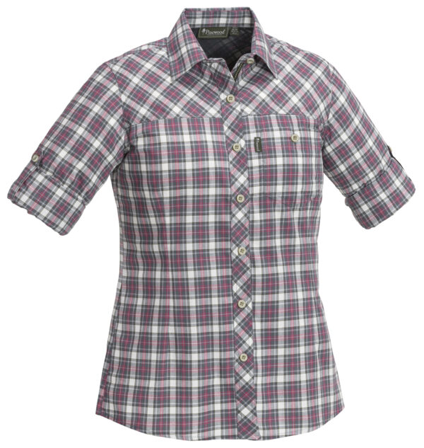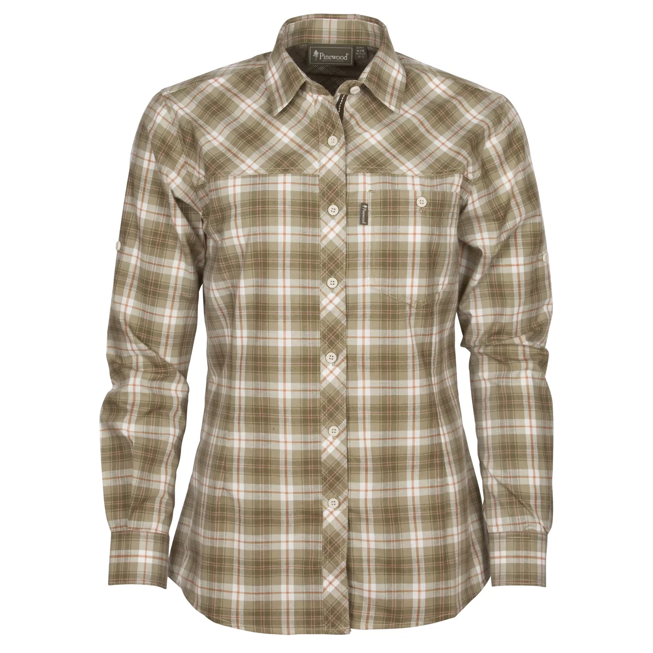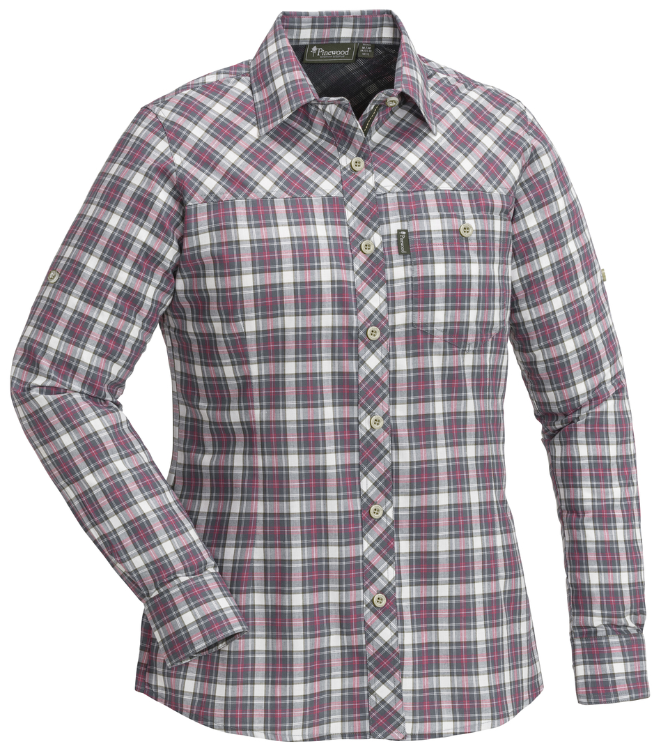Pinewood Cumbria blouse. Stijlvolle damesblouse met vrouwelijke pasvorm in eenvoudig te onderhouden stof. één borstzakje. Een riempje in de mouw maakt het mogelijk opgerolde mouwen vast te zetten. 65% polyester, 35% katoen.