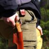 Other benefits of using a Dangler are that it is easier to sit down without the knife causing an obstruction. When the sheath hangs it will bend at the height of the hip joint which allows the knife to smoothly follow your leg movement. If you anchor it to the leg you can run, climb and bend without the knife getting in the way.