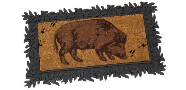 Deurmat met een wild zwijn en met bladeren rand. De robuuste “everzwijn” deurmat gemaakt van de beste kokosvezel en heeft een rubberen achterkant voor extra vochtbescherming. Dankzij het everzwijnmotief is hij ideaal voor het jachthuis of voor de voordeur.