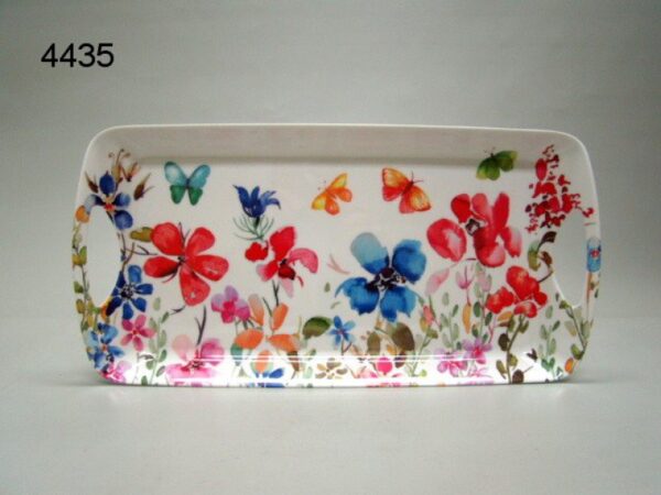 Middel grote dienblad met gekleurde vlinders afgebeeld.