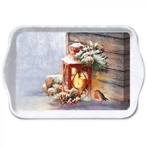 Handig Melamine dienblaadje roodborstje bij een windlicht. Serveer in kerststijl! Afmeting: 13×21 cm Afwasbaar.