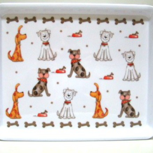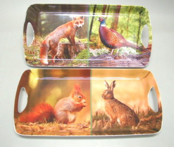 Middelgroot dienblad met bosdieren. Twee verschillende dessins (onze keuze). Afwasbaar.
