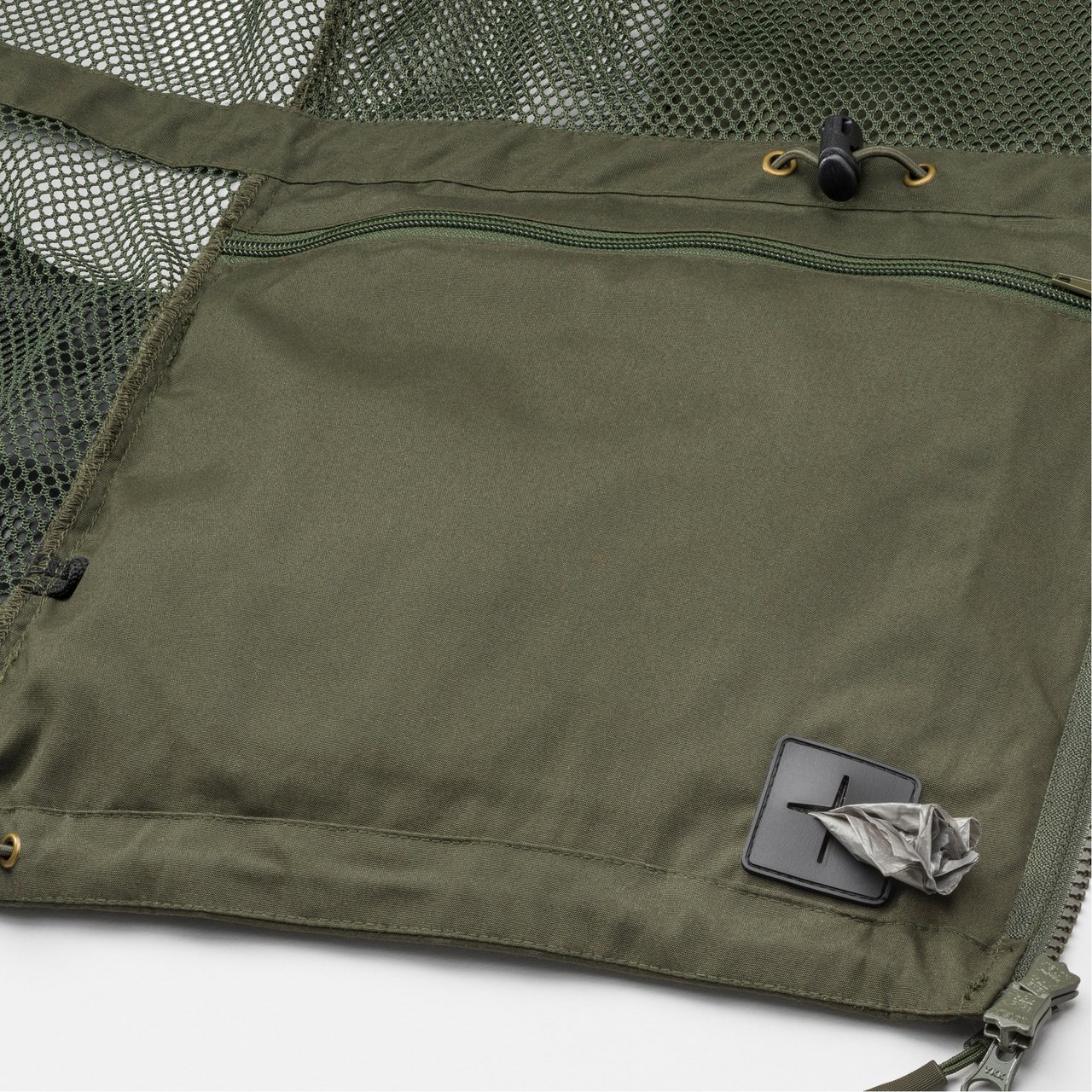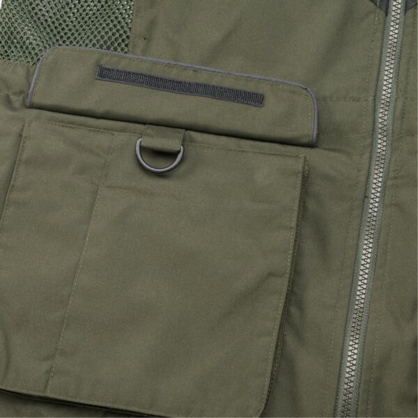 Handzakken en dubbele borstzakken. Twee binnenzakken – gemakkelijk te bereiken, waarvan één met een rubberen opening voor hondenpoepzakjes. Kleine borstzakken voor clicker en potlood.
