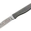 The blade has indentations at the back, and is decorated with acid-engraved arabesques. The blade has no nail-nick, but is easily grasped for opening since it tapers at the spine.